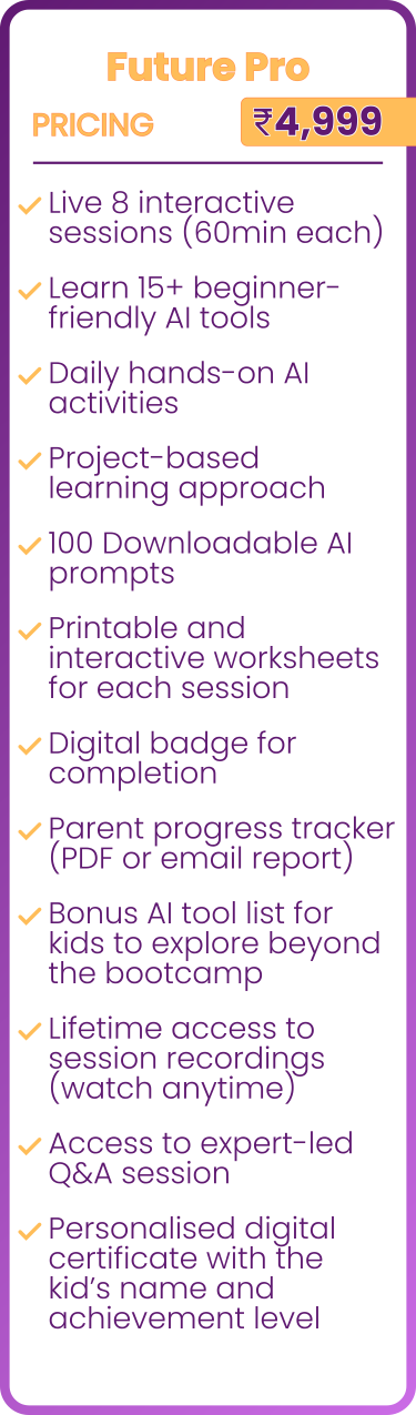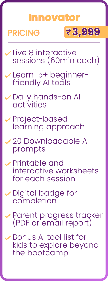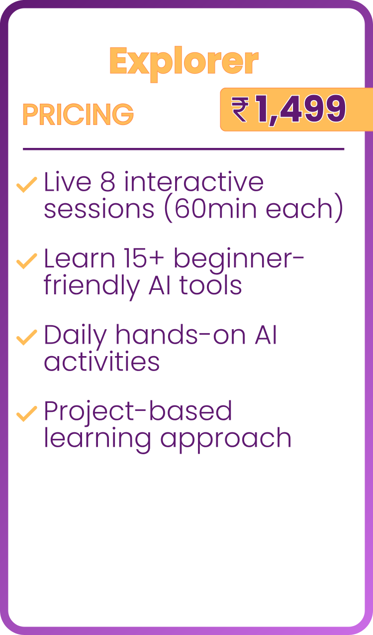 Our 8-Day AI Bootcamp is designed for students of Grade 6-12. The content is beginner-friendly, engaging, and tailored to match their learning level while introducing them to real-world AI tools.